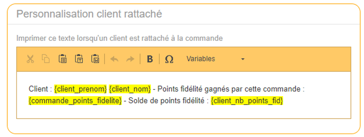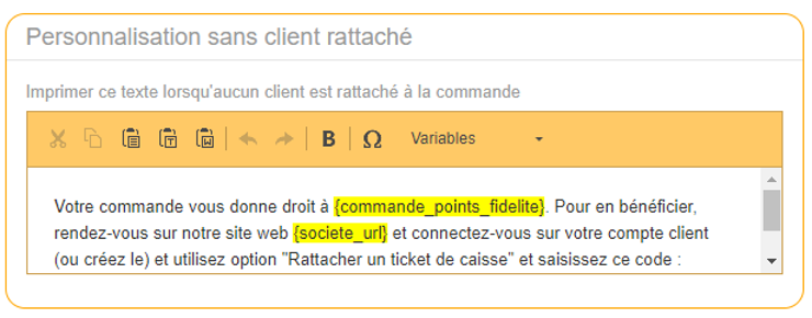 Personnalisation Message Ticket de Caisse avec client rattachéLe restaurateur peut, à l’aide d’un texte personnalisable, informer par exemple son client du nombre de points de fidélité gagnés grâce à la commande ainsi que le nombre de points de fidélité qu’il possède.