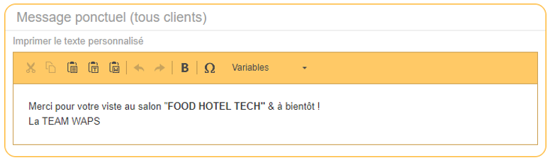 Message Ponctuel Ticket de caisseLa solution Restô permet d'afficher un message qui sera présent en bas du ticket de caisse.