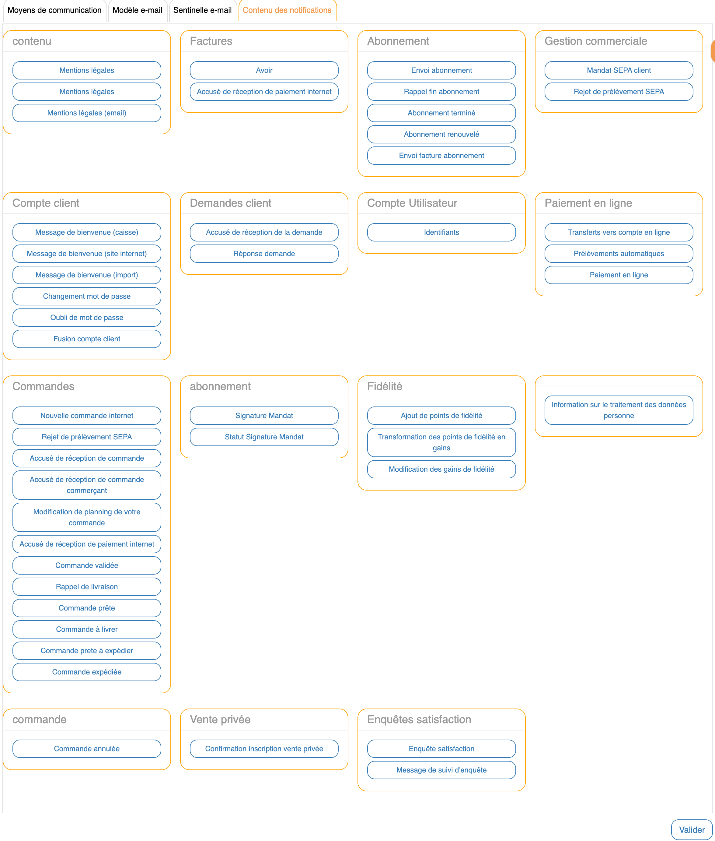Interface Paramètres - Votre communication - Notifications clientPour ce faire, il faut se rendre dans les « Paramètres » puis dans le bloc « Votre communication » cliquer sur « Notifications client ».