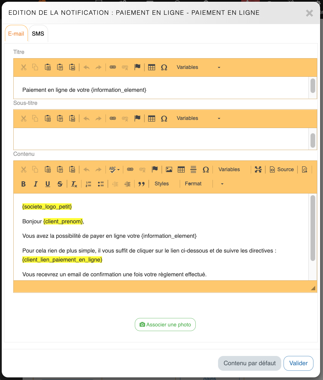 Exemple : La variable {client_prenom} sera remplacé par le prénom du client et la variable {societe_logo_petit} par le logo de petite taille. Si aucune valeur n'est définie pour une variable, la valeur sera vide.