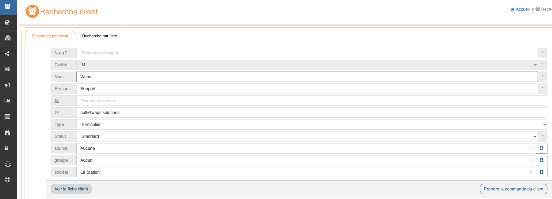 Recherche client trouvéAprès avoir sélectionné le client de votre choix, il est possible de voir la fiche client complète ou de prendre la commande du client.