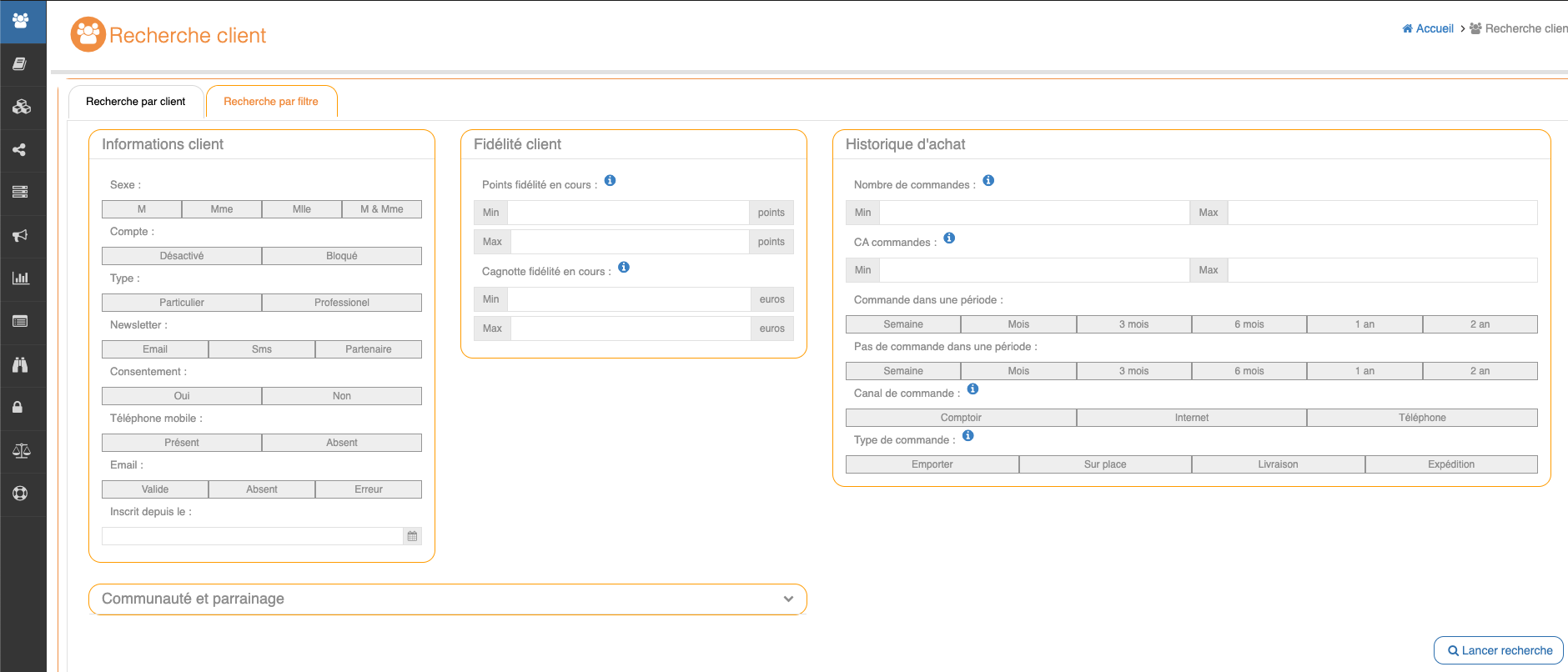 Recherche clients par filtreDepuis l'onglet « Recherche par filtre », il est possible de rechercher des clients en filtrant les résultats grâce à des critères tels que les informations clients, leur programme de fidélité, leurs dernières commandes ou encore leur groupe ou société.