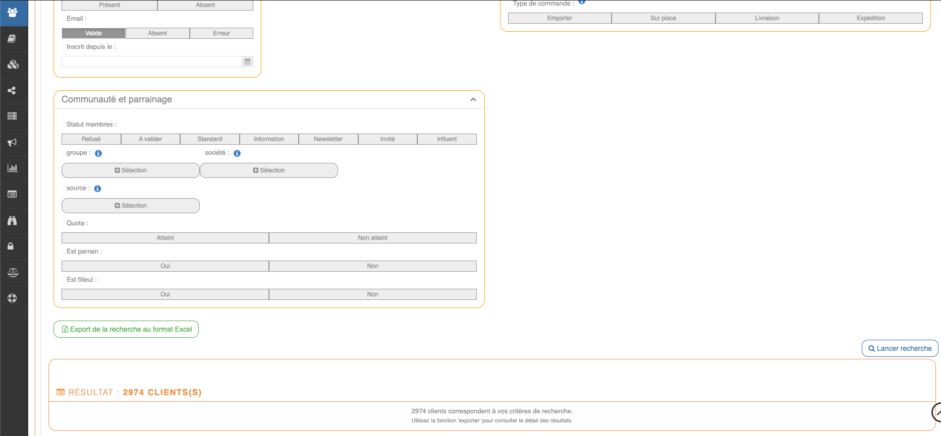 Recherche clients par filtre RésultatsAprès avoir sélectionné les filtres, il ne reste plus qu'à Lancer la recherche pour afficher les résultats de la recherche. Il est possible d'exporter la liste des clients au format Excel.