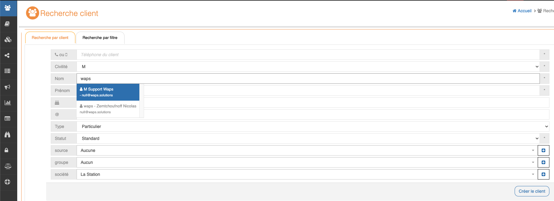 Recherche par clientPour effectuer une recherche client, il suffit de commencer à écrire son numéro, son nom ou son prénom afin d'avoir des propositions de clients.