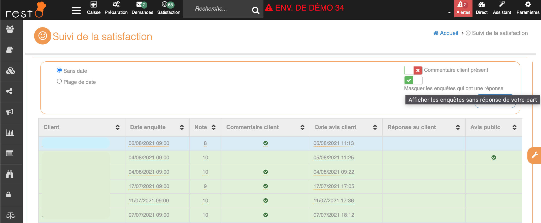 Interface de suivi de la satisfactionIl est possible de trier les avis pour masquer les enquêtes qui ont déjà reçu une réponse. Pour répondre à un avis client, il suffit de cliquer dessus pour afficher le détail de la note du client.
