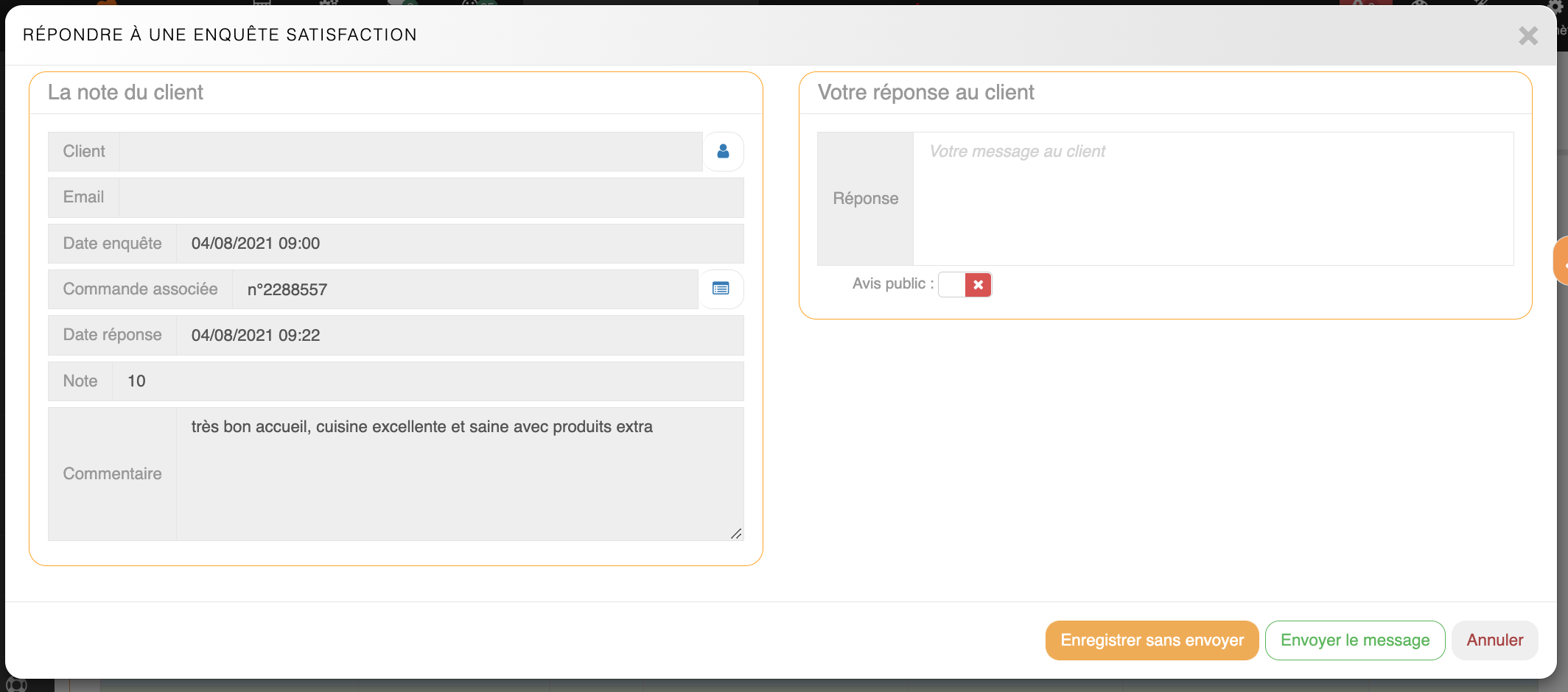 Fenêtre de réponse à une enquête de satisfactionAprès avoir lu le commentaire du client, le restaurateur peut y répondre et rendre l'avis du client public sur le site internet. Une fois le message envoyé, le client recevra la réponse par mail.