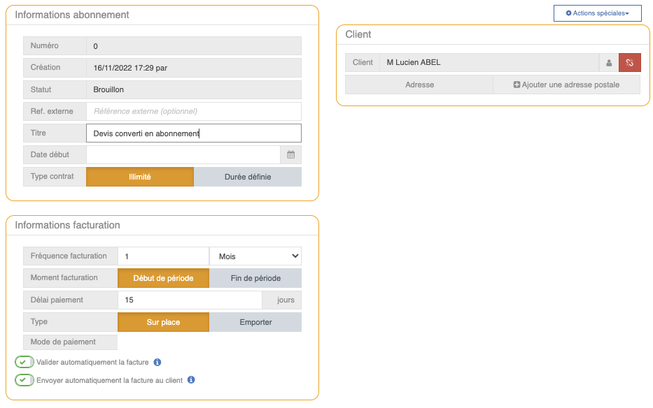 Devis transformé en abonnementLe compte client et le contenu de l'abonnement correspondent au devis. Il ne reste plus qu'à définir les informations de facturation avant de valider l'abonnement.