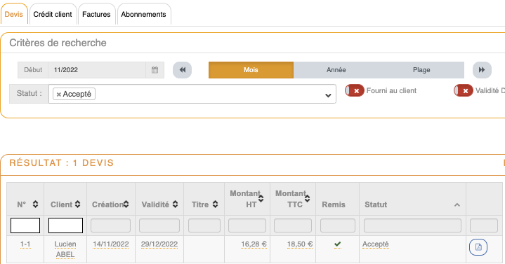 Lorsqu'un devis a été créé et finalisé, il passe à l'état « En attente de réponse » et peut être envoyé au client par mail afin qu'il puisse l'accepter ou le refuser (voir Créer un devis). En accédant à l’interface de Gestion Commercial puis à ...