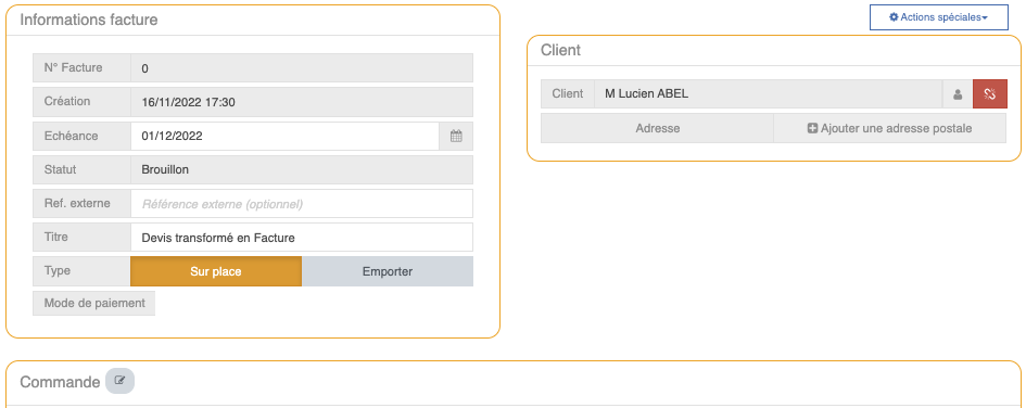 Transformer un devis en factureUne fois transformé en facture, le devis passe au statut « Facturé » et le restaurateur est redirigé vers l'interface d'édition de la facture.
