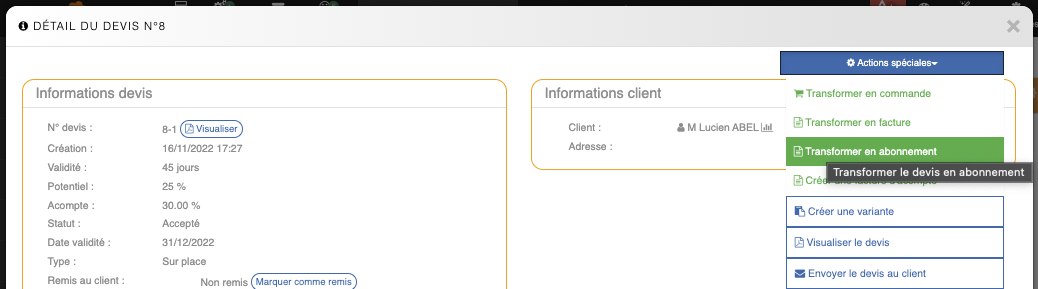 Accepter/refuser un devis), il est possible de transformer le devis en commande, en facture ou en abonnement.