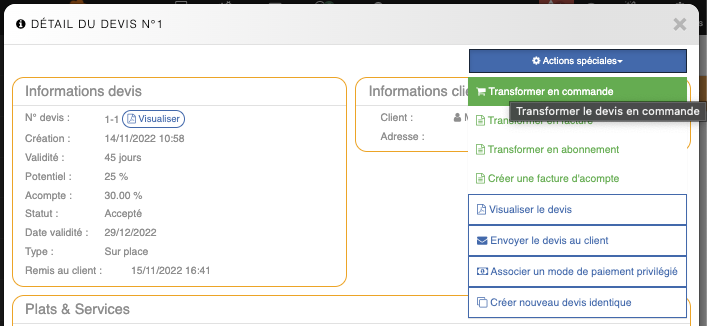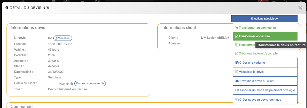 Transformer un devis en commande permet de créer un panier de commande avec les produits présents dans le devis pour le client associé.
