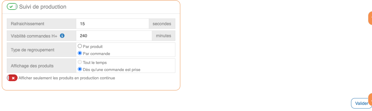 Interface Suivi de production digitalAprès avoir activé le suivi de production, il est possible de définir à quelle fréquence l'interface « Préparation » s'actualise ainsi que le type d'affichage des commandes.
