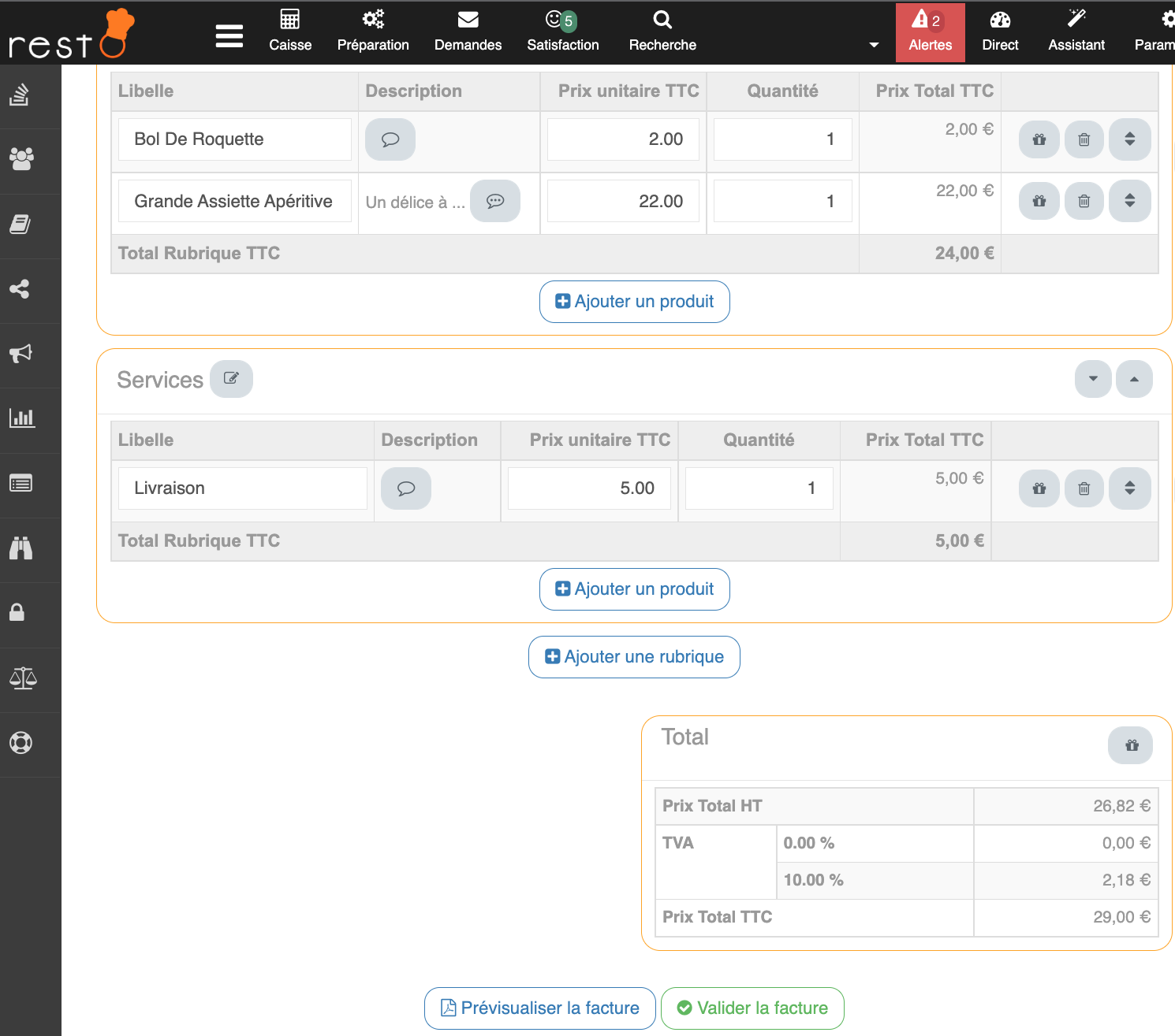 Modifier une facture en brouillonCette interface permet de modifier le contenu de la facture avant de « Valider la facture ».