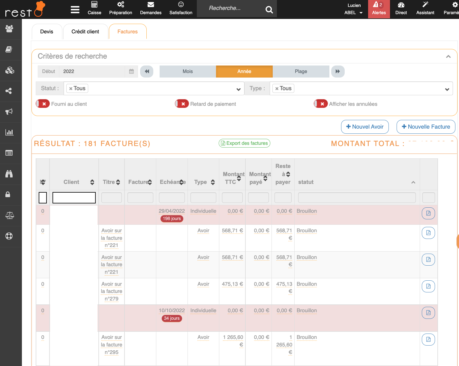 La solution Restô permet de créer des factures (voir Créer une facture). Lorsqu'une facture a été validée, elle passe au statut « En attente de paiement » (voir Valider une facture). Pour régler cette facture, il faut aller dans l'interface « Gestion ...